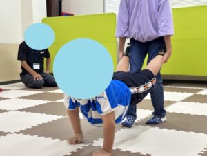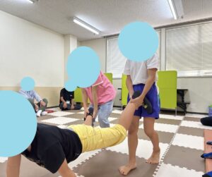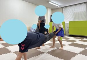 片足ずつお友達が足を持つので、前のお友達はバランスが難しく負荷がかかります。