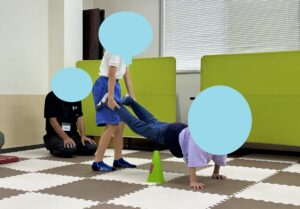 今日の運動遊びの様子です。上手に2人組の手押し車ができてきたので
