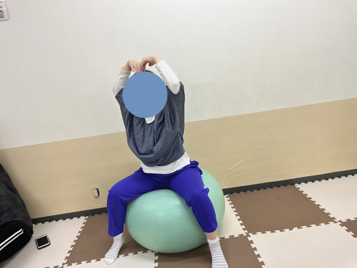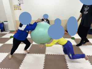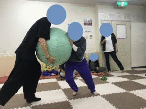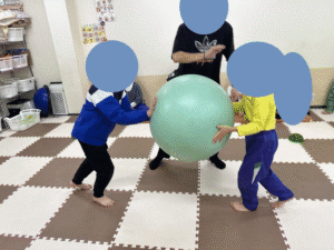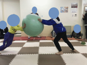 バランスボールを二人で持ち、相撲を行いました(^^♪