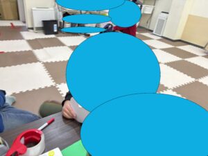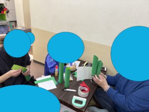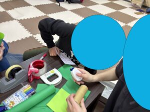 「ここってどうやったら切れるかな…」「糊貸してください!」など、工作に取り組む中にもいろいろな会話やコミュニケーションが取れた時間でした”(-“”-)”