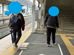 「ホームはこっちかな…」「あ…!向こう側のホームだった!」と友達と相談したり、チェックしたりしながら電車を待ちます。