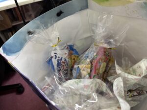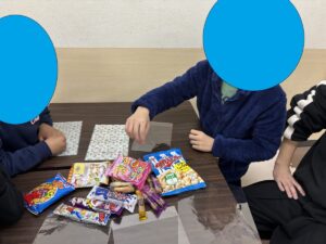 揃ったら、景品ゲットをゲットできます。実は袋詰めされたこのお菓子たち、詰めてくれたのは子供たちでした”(-“”-)”