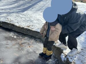 複合遊具から少し離れたところに行ってみると、池の氷が凍っておりお友達は「乗ってみたい!!!」という気持ちがいっぱい・・・