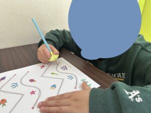 机に向かい集中して行うお友達。点から点へゆっくり線を書いていました。